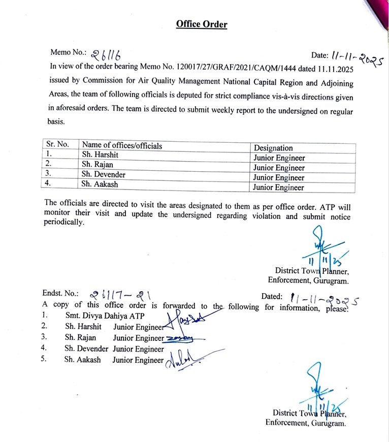गुरुग्राम, 13 नवंबर। एनसीआर क्षेत्र में प्रदूषण के बढ़ते स्तर व सीएक्यूएम द्वारा लागू ग्रेप के तीसरे चरण के दृष्टिगत गुरुग्राम के डिस्ट्रिक टाउन प्लानर ने चार सहायक अभियंताओं को वायु प्रदूषण पर नजर रखने के लिए नियुक्त किया है।