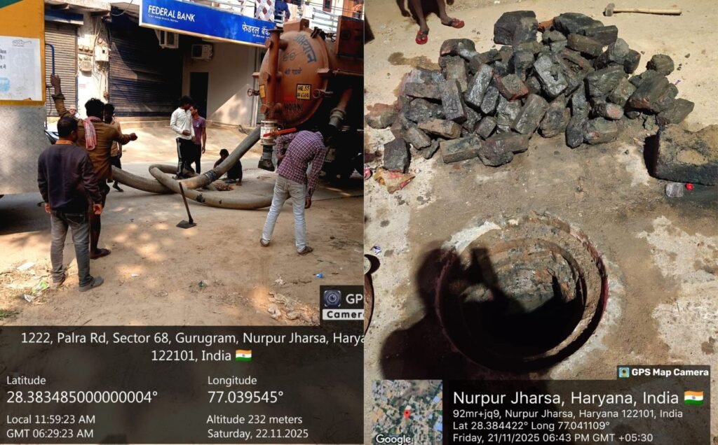 गुरुग्राम, 22 नवंबर। नूरपुर क्षेत्र में नगर निगम गुरुग्राम द्वारा सीवर लाइन की सफाई का अभियान तेज गति से जारी है। नूरपुर मोड़ पर नियमित सफाई के दौरान निगम की टीम को मैनहोल में ईंटें, पत्थर और अन्य ठोस सामग्री मिली, जिसे देख टीम भी हैरान रह गई। प्रारंभिक जांच में यह स्पष्ट हुआ कि किसी शरारती तत्व ने जानबूझकर ये सामग्री सीवर लाइन में डालकर उसे जाम करने की कोशिश की थी। अधिकारियों के अनुसार, सीवर लाइन के साथ इस प्रकार की छेड़छाड़ एक दंडनीय अपराध है और इसके गंभीर परिणाम हो सकते हैं।