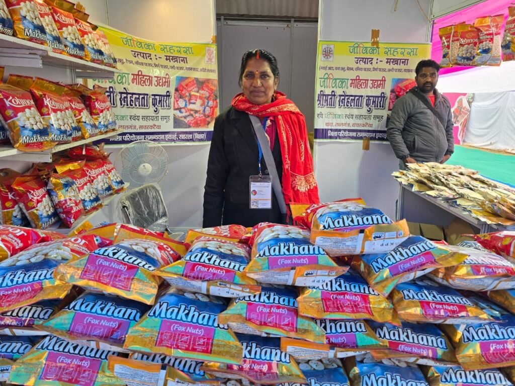 बिहार से आईं गीता दीदी अपने स्टॉल पर पारंपरिक विधि से तैयार मखाने प्रस्तुत कर रही हैं। मखाना उत्पादन की प्रक्रिया अपने आप में रोचक है। तालाब में बीज डालने के लगभग छह महीने बाद तैयार बीजों को निकाला जाता है। इन्हें टोकरी में एकत्र कर साफ पानी से धोया और धूप में सुखाया जाता है। इसके बाद रेत में गर्म कर लकड़ी से पीटने की पारंपरिक तकनीक से मखाने तैयार किए जाते हैं। यही प्रक्रिया इन्हें खास स्वाद और शुद्धता प्रदान करती है।