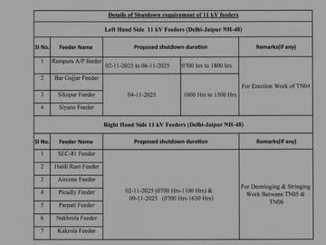 जारी शेड्यूल के अनुसार, रामपुरा फीडर पर 2 नवंबर से 6 नवंबर तक रोजाना सुबह 7 बजे से शाम 6 बजे तक बिजली आपूर्ति बाधित रहेगी। इसी तरह, बार गुज्जर, शिकोहपुर और सियानों फीडर पर 4 नवंबर को सुबह 10 बजे से दोपहर 3 बजे तक बिजली कटौती होगी।